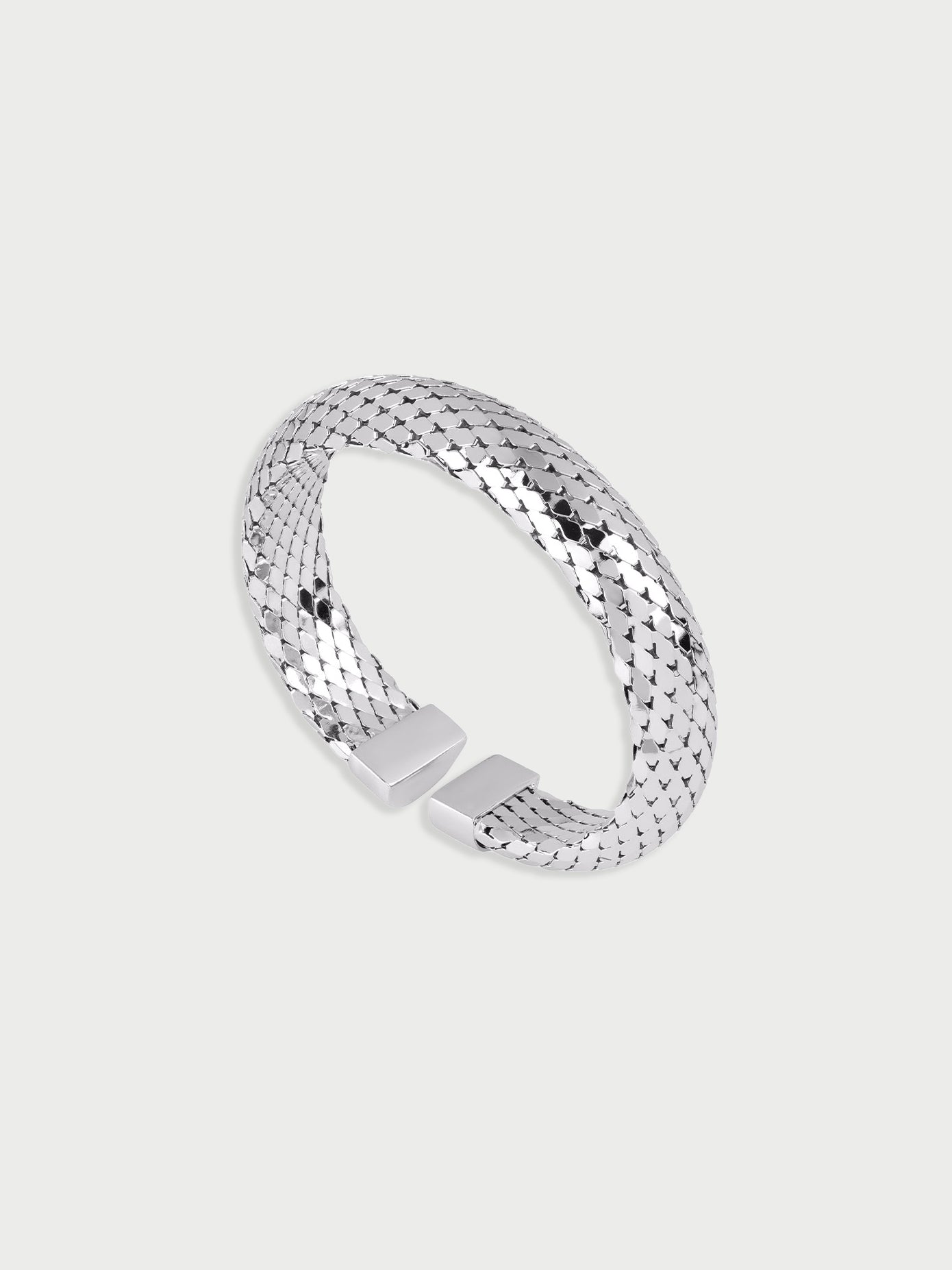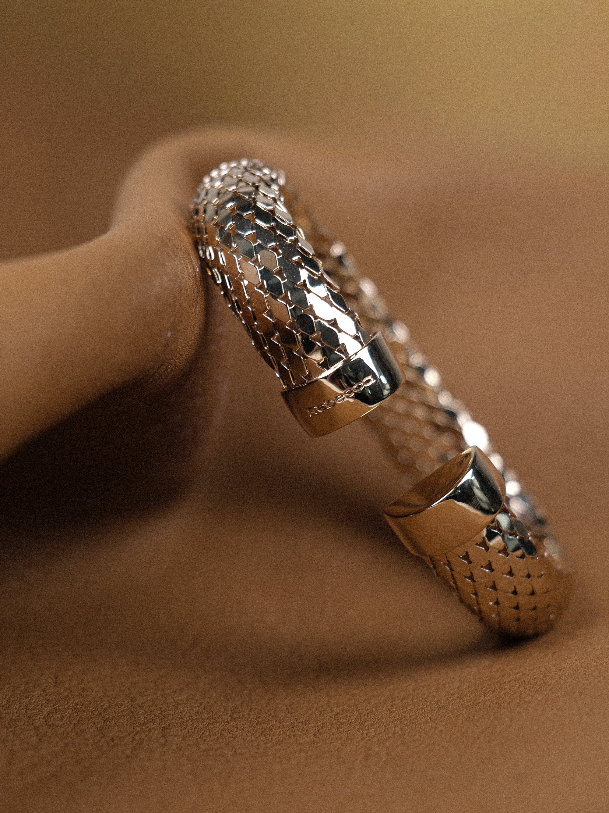 Bracciale rigido Athena in bronzo profilo tubolare, texture squama. Misura unica, regolabile.