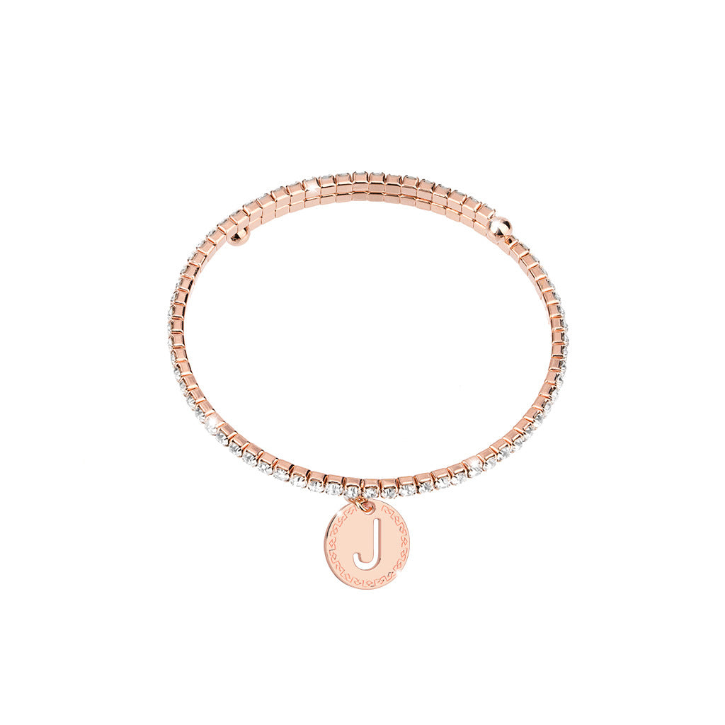 Il bracciale MyWorld a molla è in bronzo placcato con charm lettera pendente e cristalli. Finitura oro rosa.