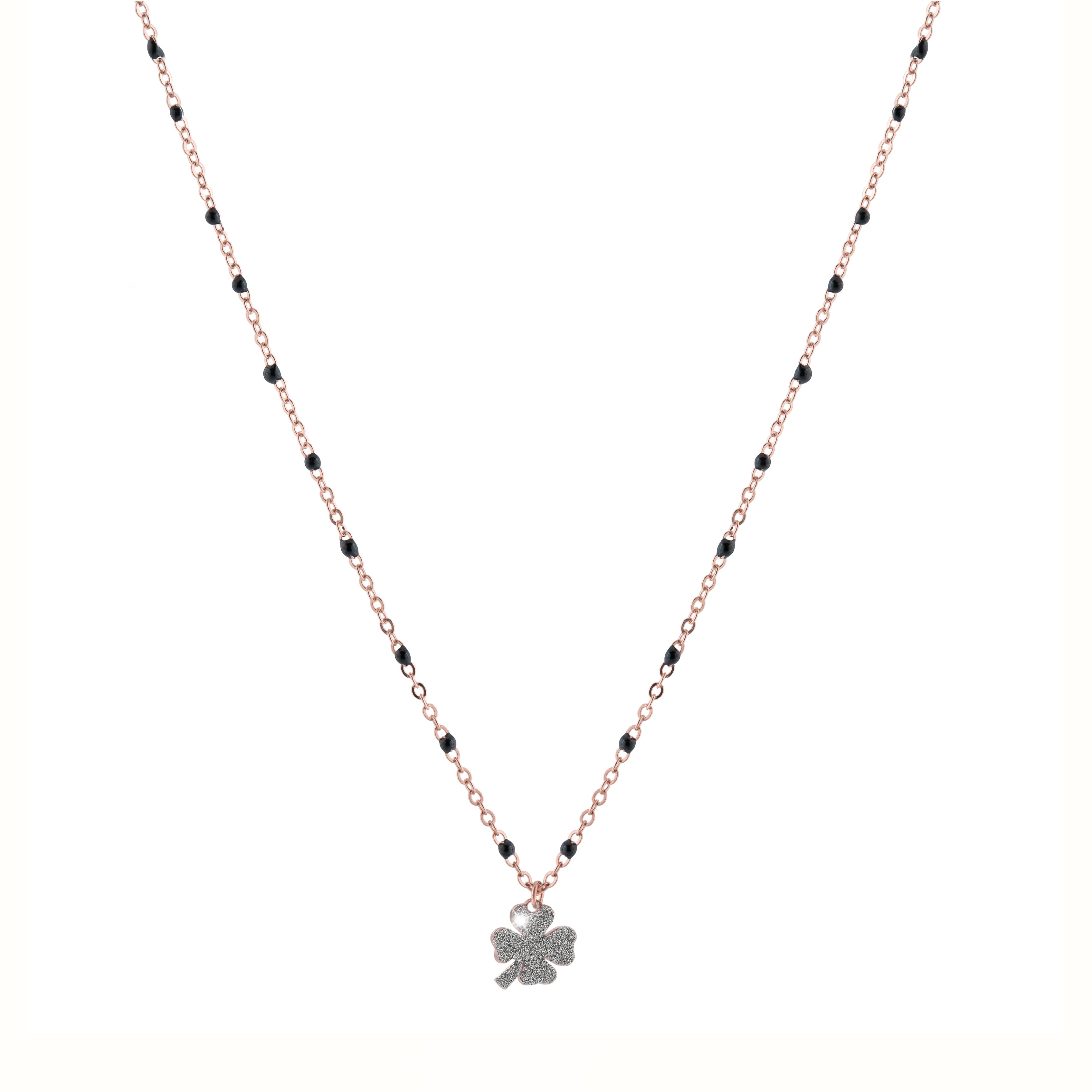 Collana Jolie in argento placcato oro con pietre nere e pendente a forma di quadrifoglio in polvere di diamanti. Lunghezza regolabile dai 40 ai 45 cm. Disponibile nelle finiture oro giallo oro rosa o rodio bianco.