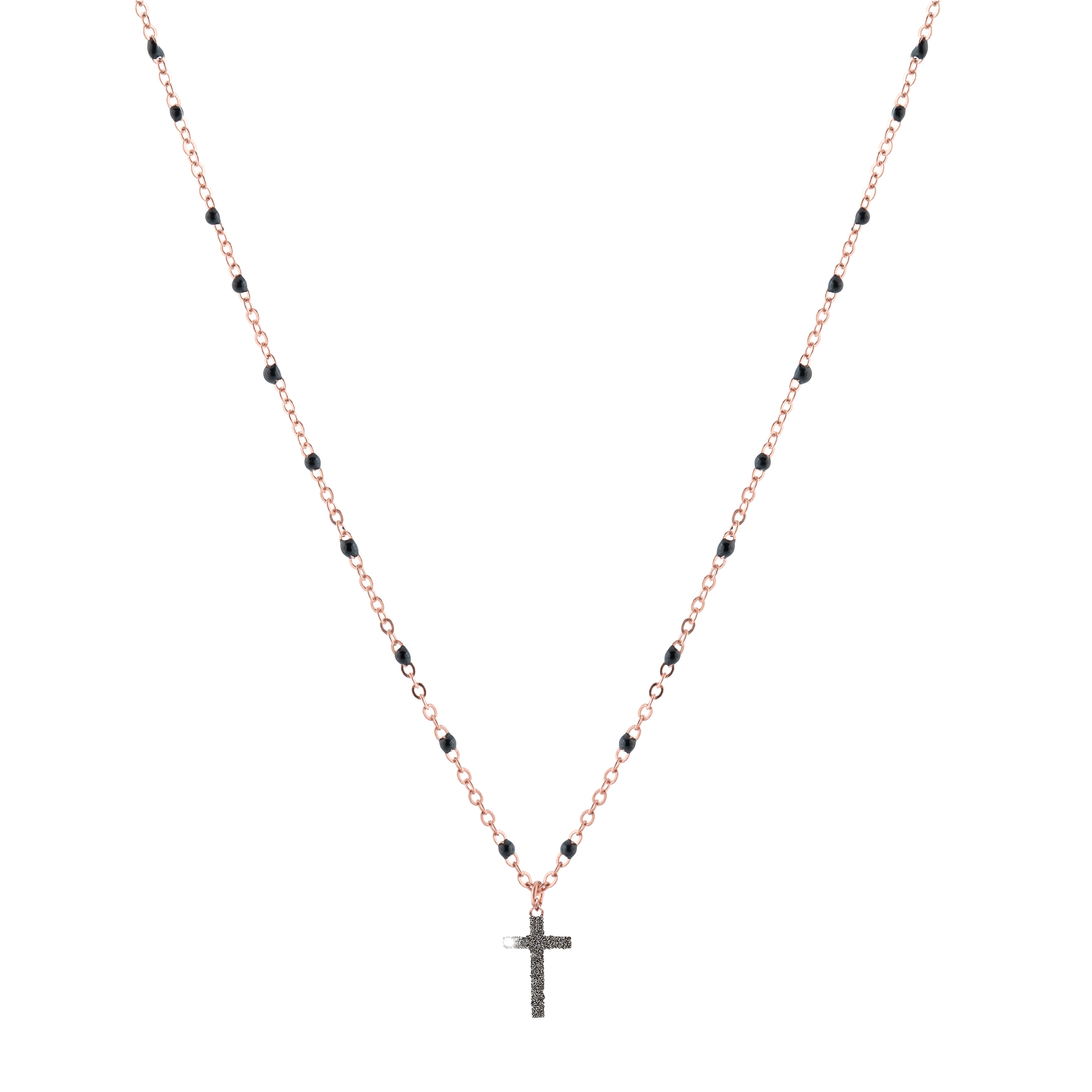 Collana Jolie in argento placcato oro con pietre nere e ciondolo a forma di crocifisso in polvere di diamanti. Lunghezza regolabile dai 40 ai 45 cm. Disponibile nelle finiture oro giallo oro rosa o rodio bianco.