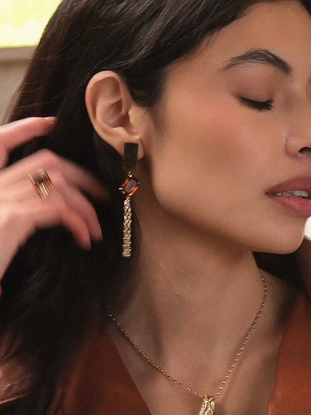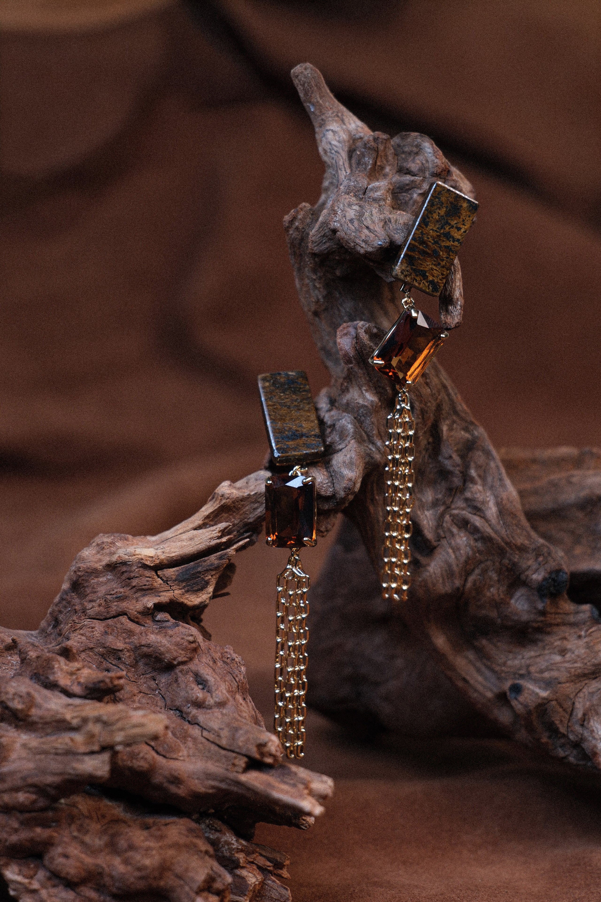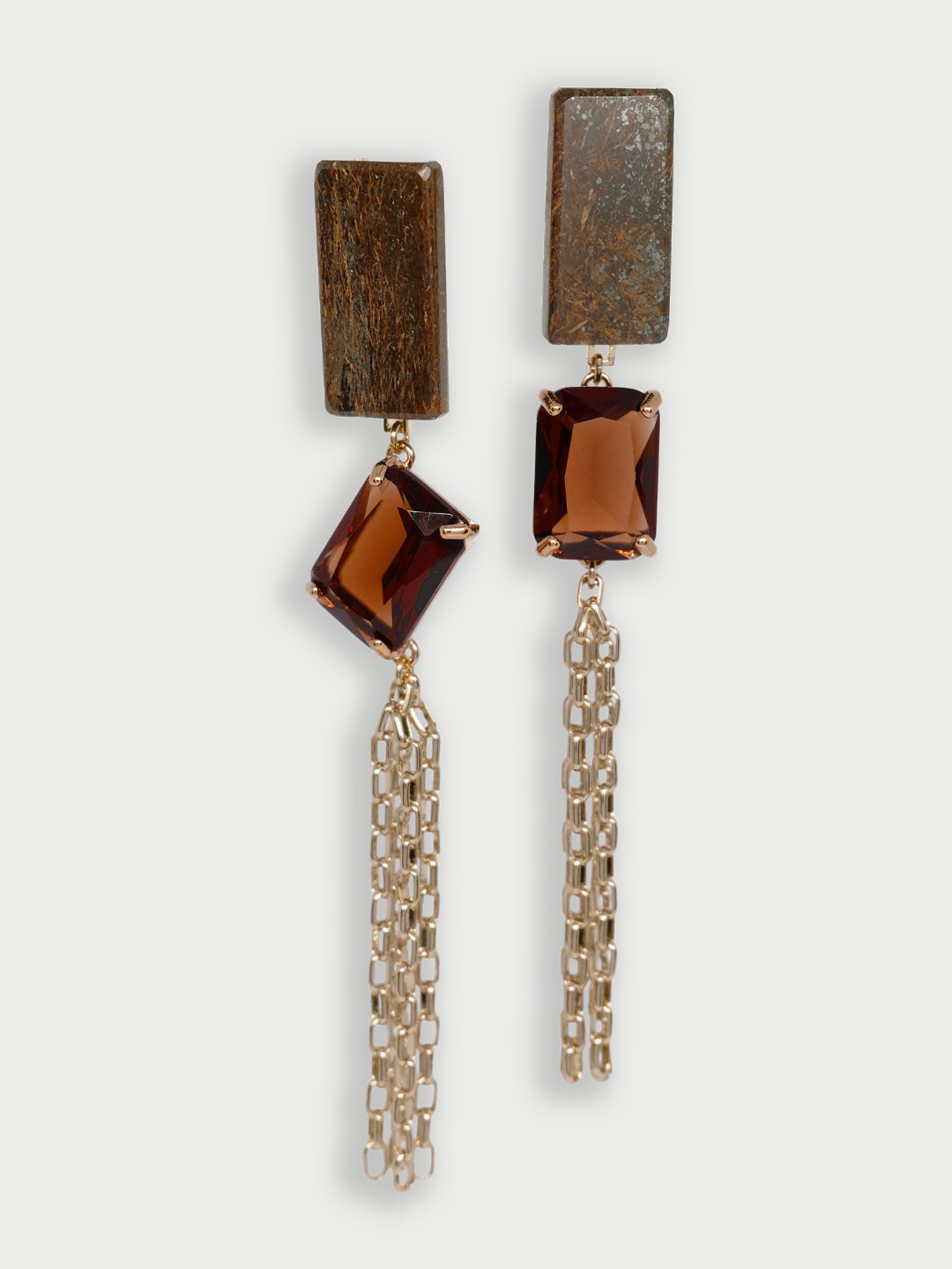 Orecchini pendenti collezione Woodish con pietra naturale Bronzite e nappa in catena. Lunghezza totale di 6 cm.