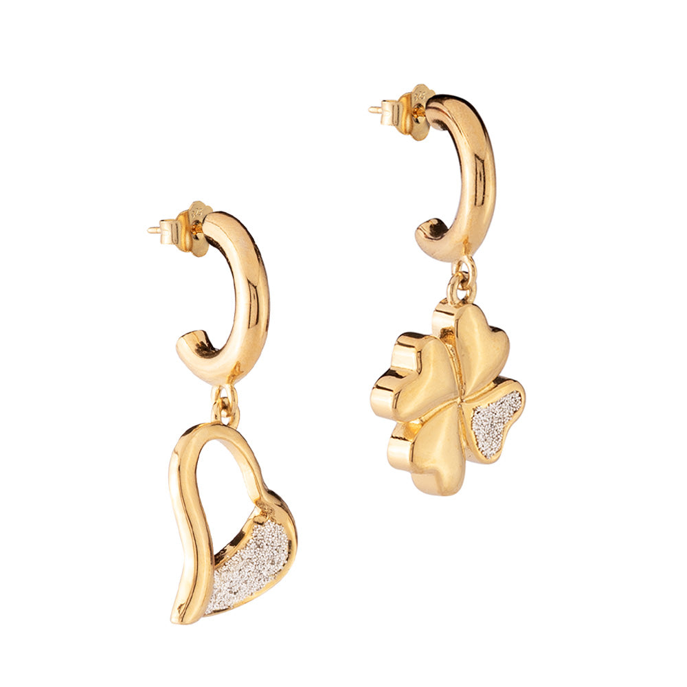 Orecchini con pendente cuore e quadrifoglio in polvere di diamanti