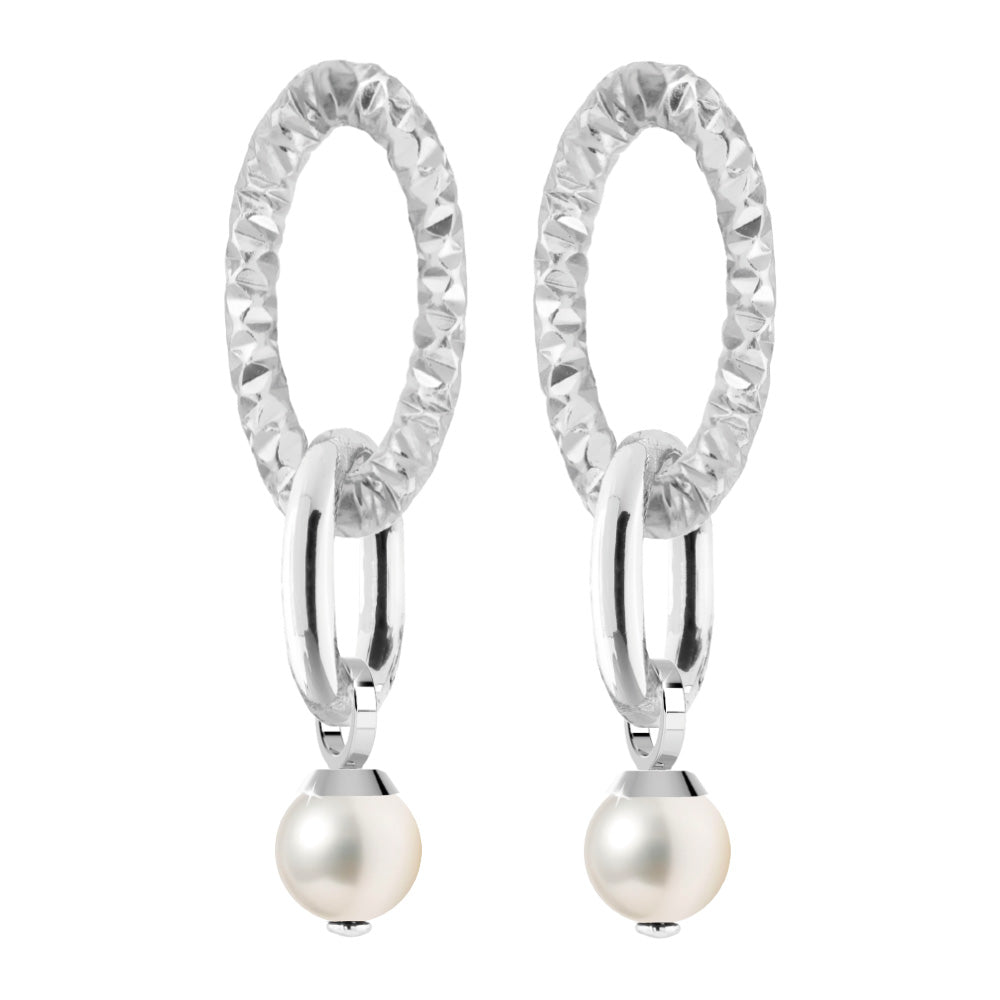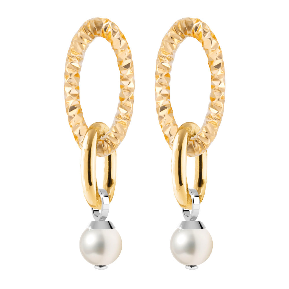 Orecchini in lega leggera placcato oro 24 kt. Pendenti con maglia mix diamantata ovale grande e liscia piccola con perla.