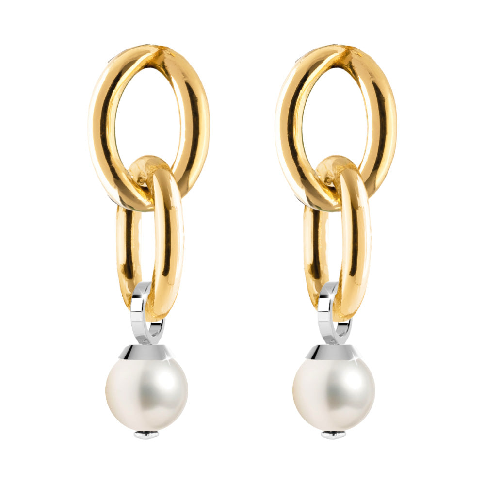 Orecchini in lega leggera placcato oro 24 kt. Pendenti con maglia ovale liscia e perla.