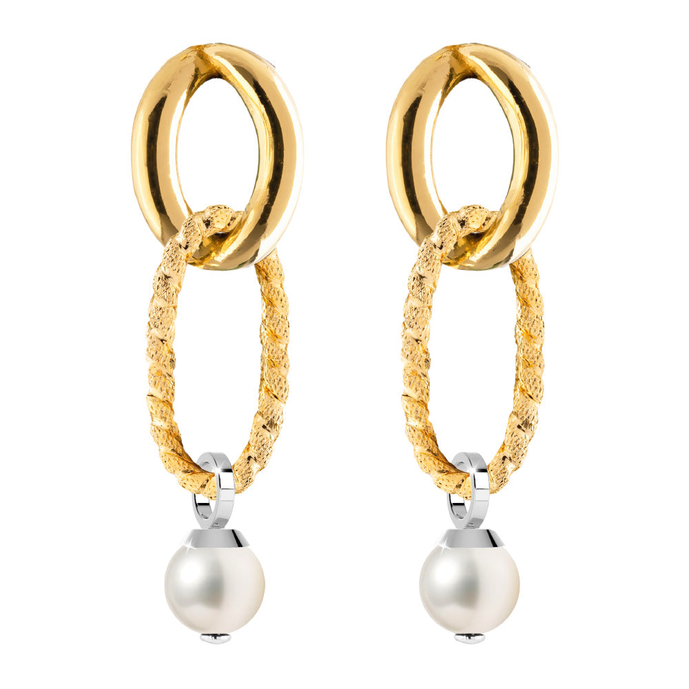 Orecchini in lega leggera placcati oro 24 kt. Pendenti con maglia mix diamantata e perle.