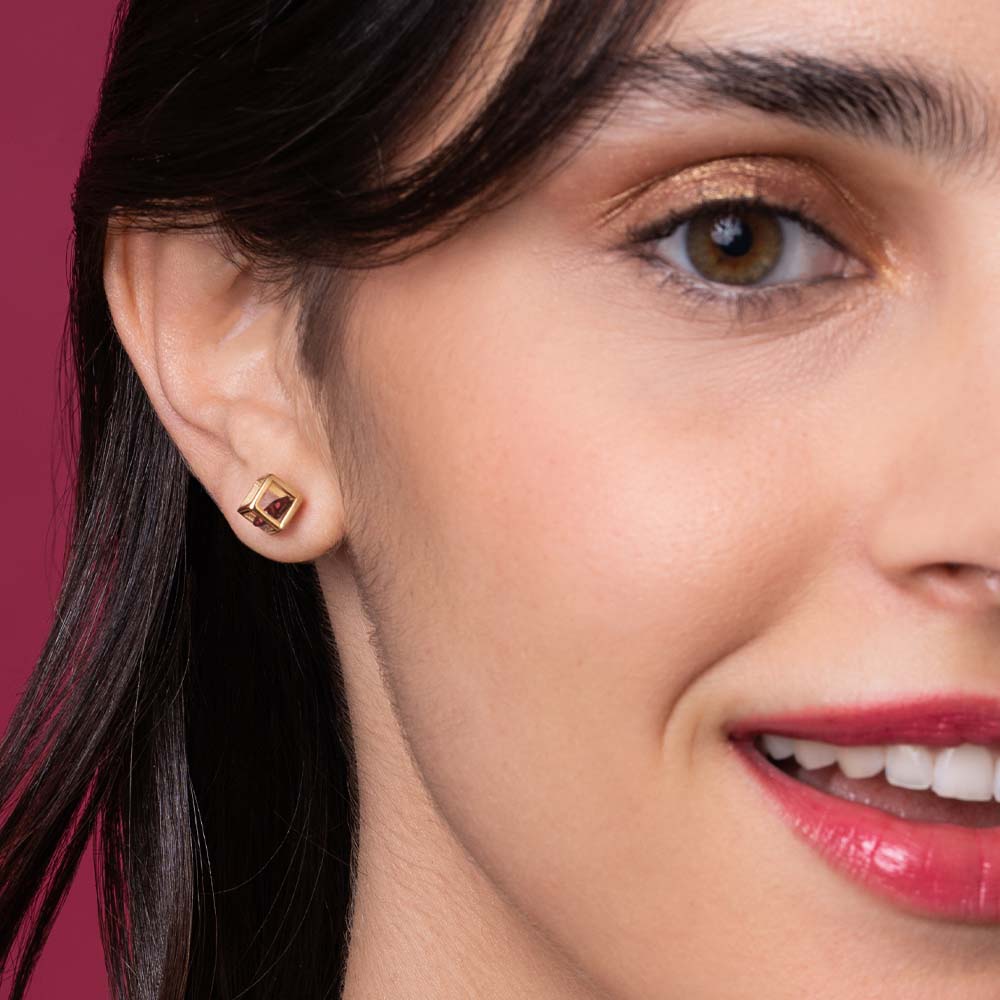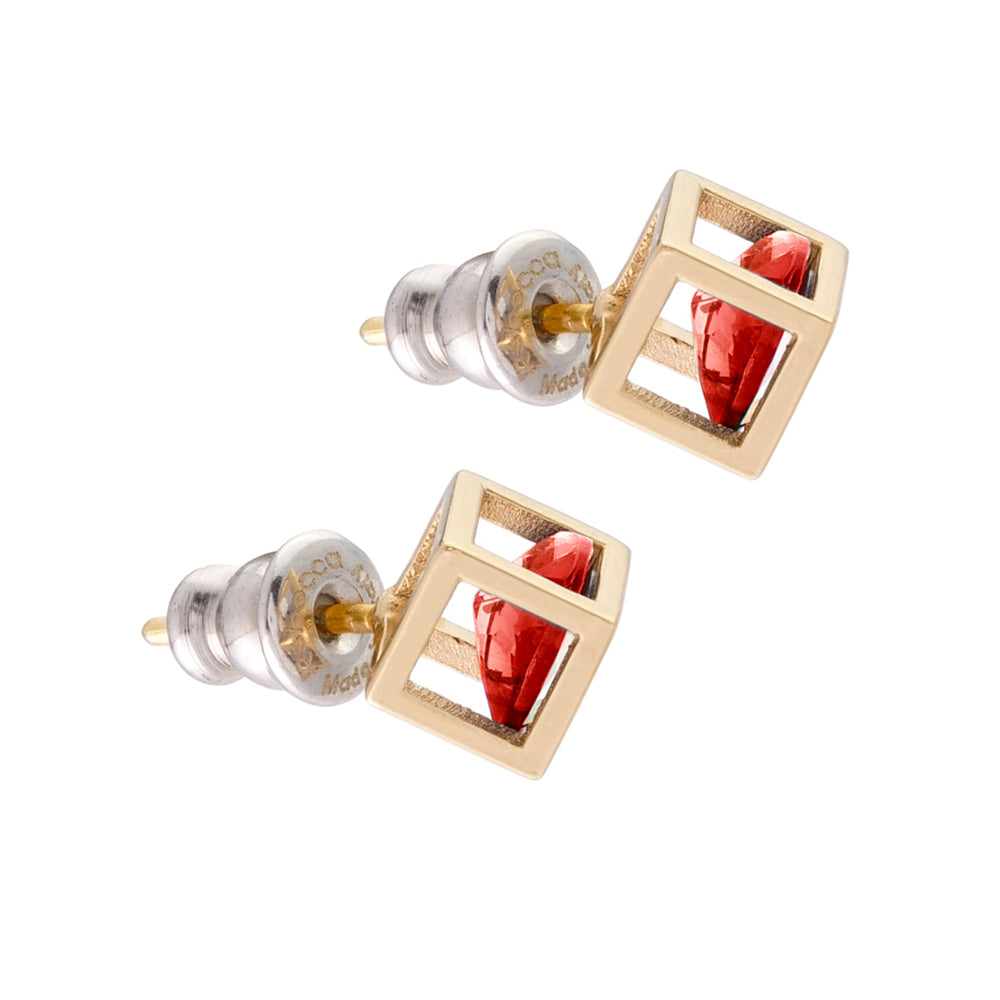 Orecchini a lobo in argento 925 placcato oro 18 kt. Pietra idrotermale a forma di cuore rosso all'interno di uno scrigno.
