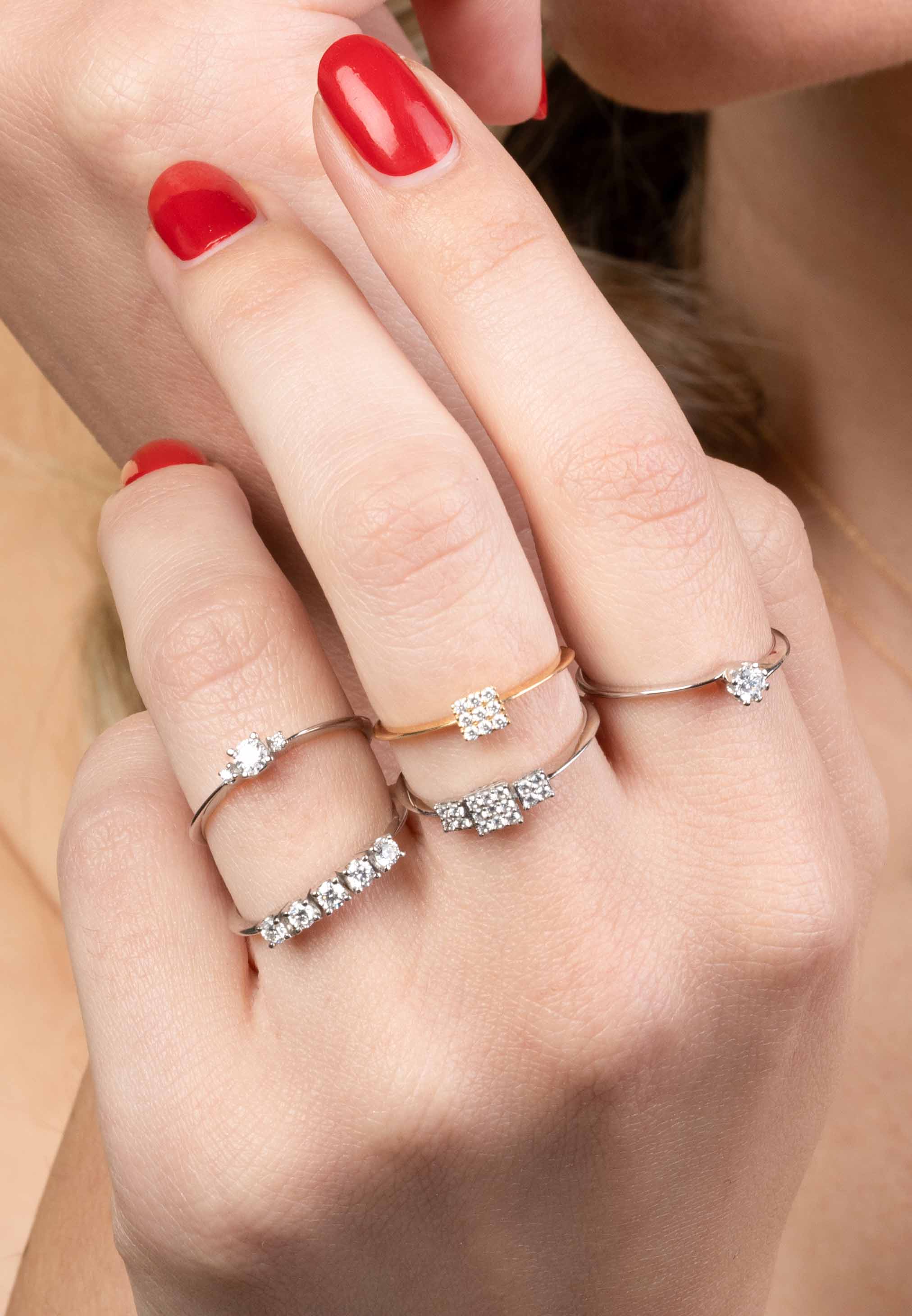 Anello Carrè Solitaire in oro 18kt e diamanti (0 077 carati). Disponibile in oro bianco e giallo.
